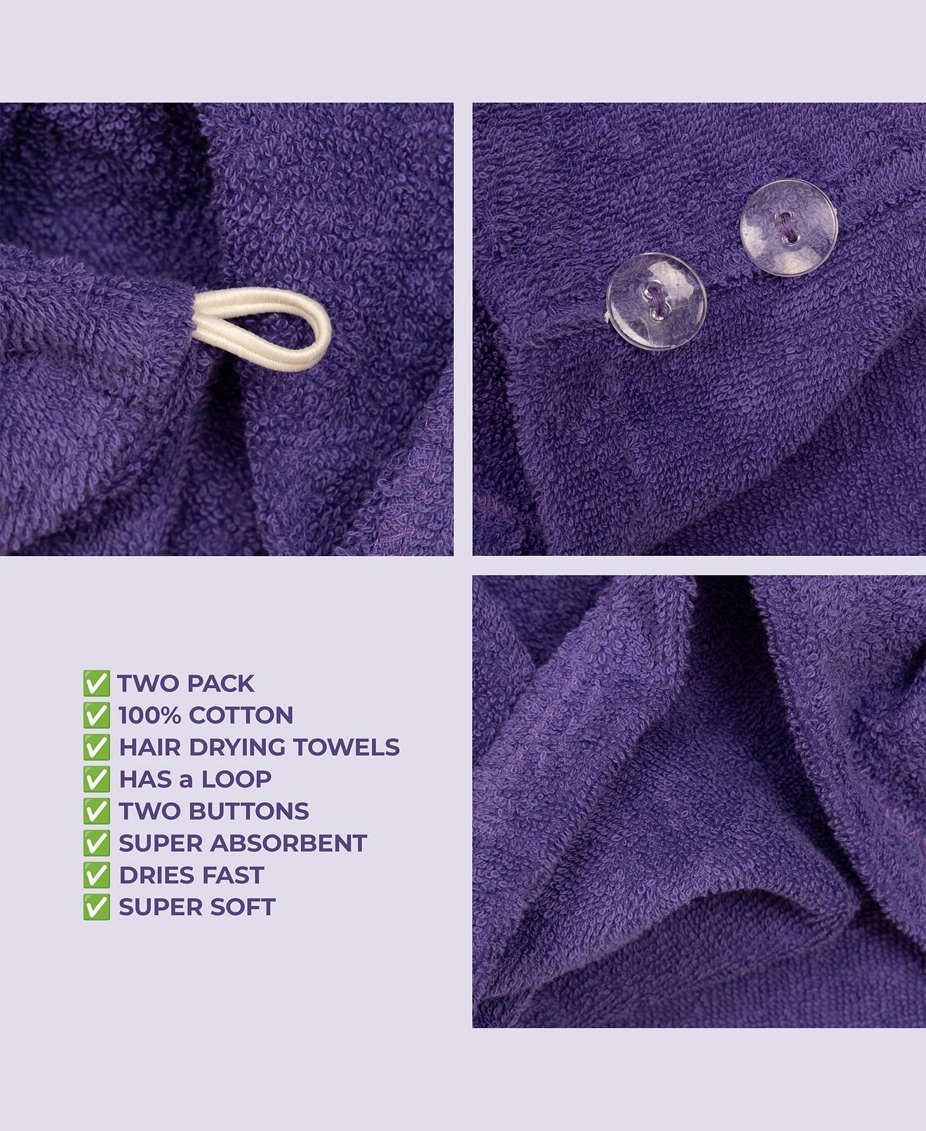 2-Pack Hair Drying Towels, 26″ x 13″ – Purple