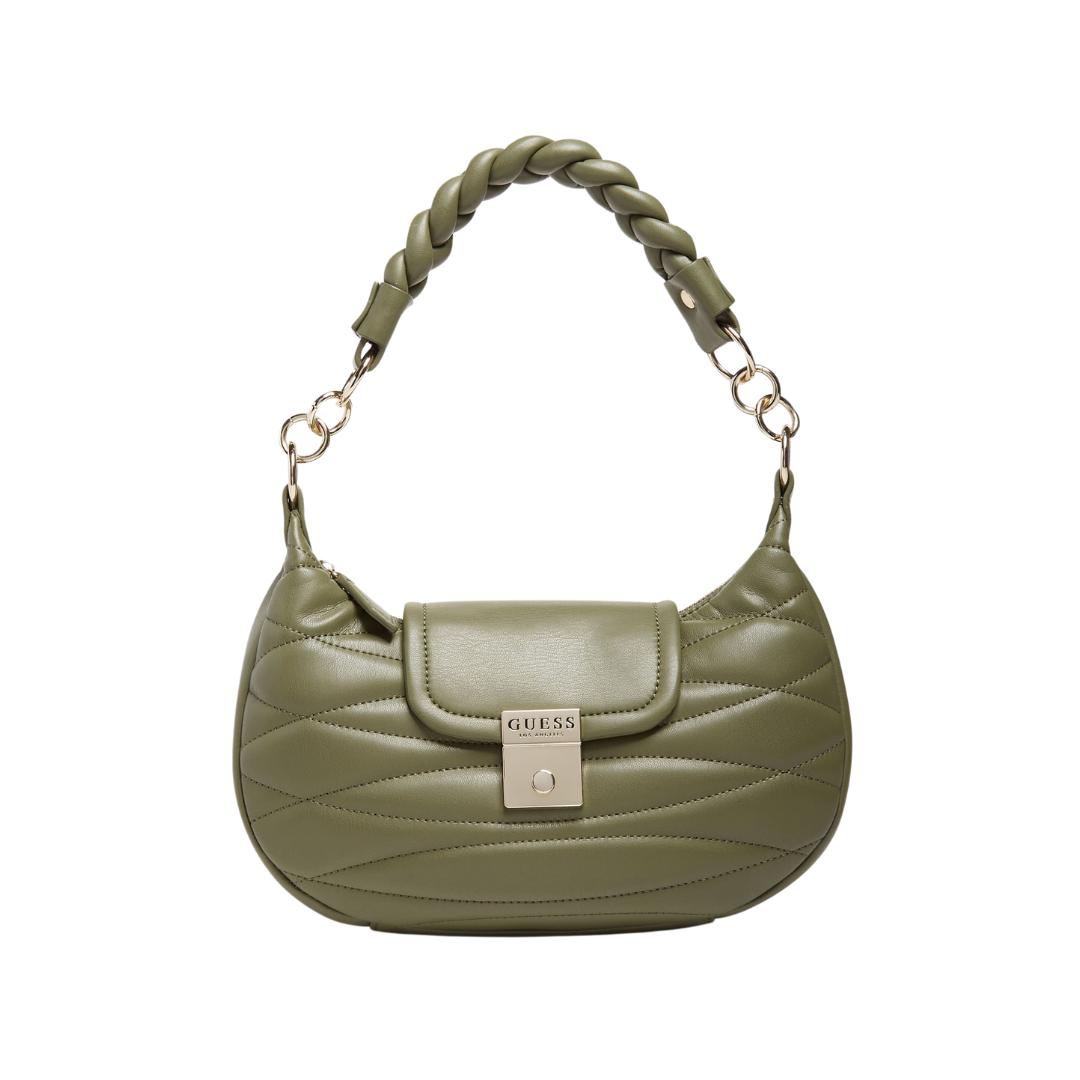 - Braided shoulder strap with chain-link connections. Adjustable, detachable crossbody strap.