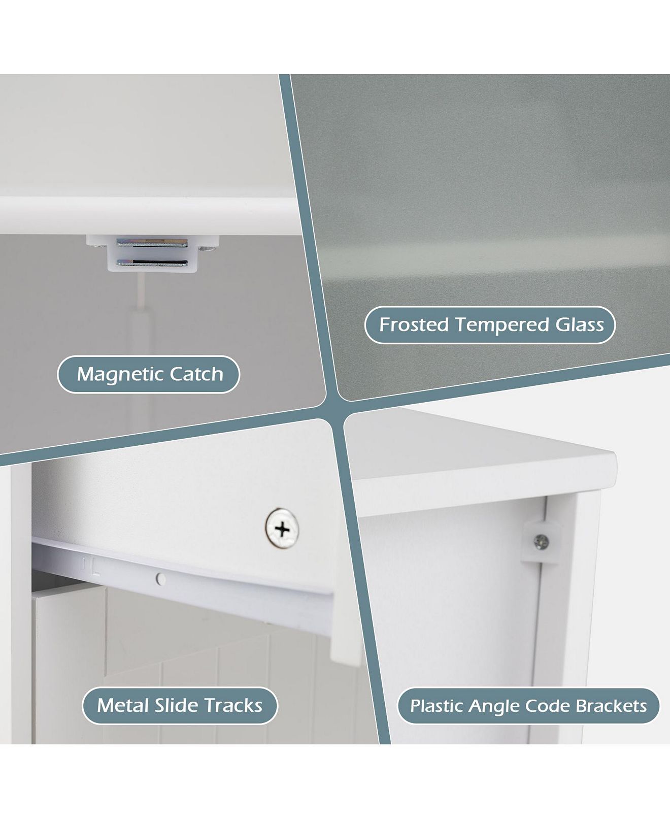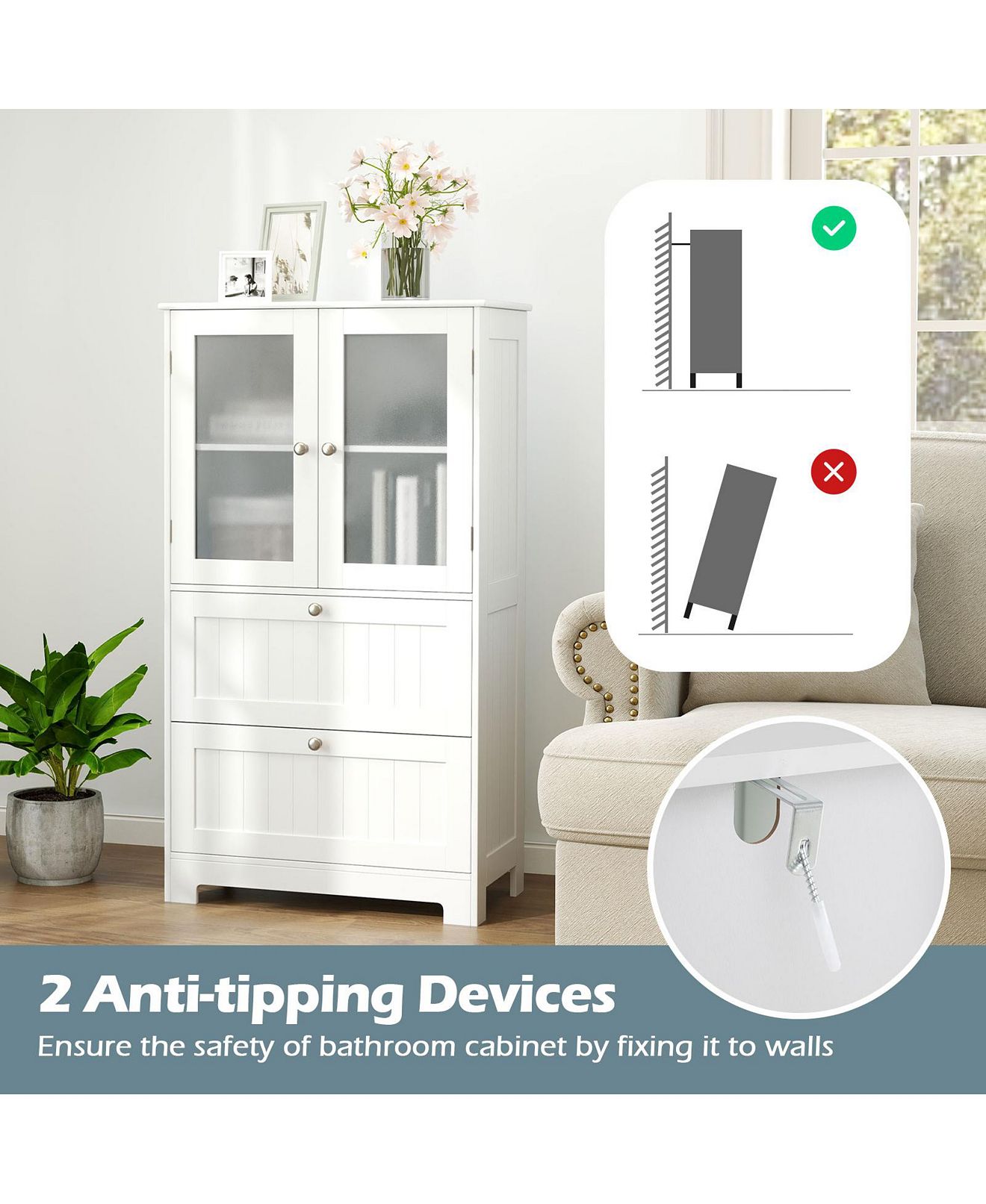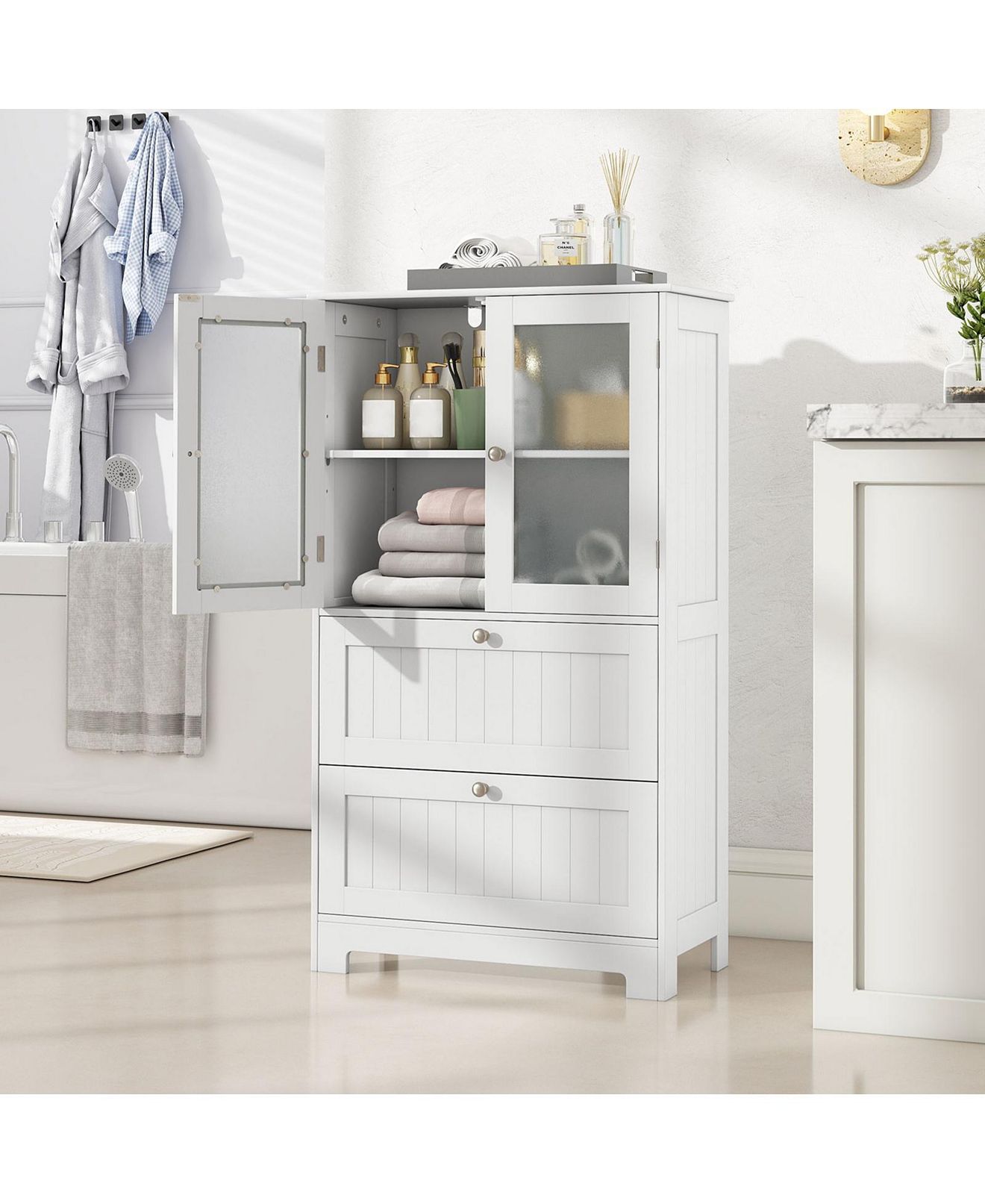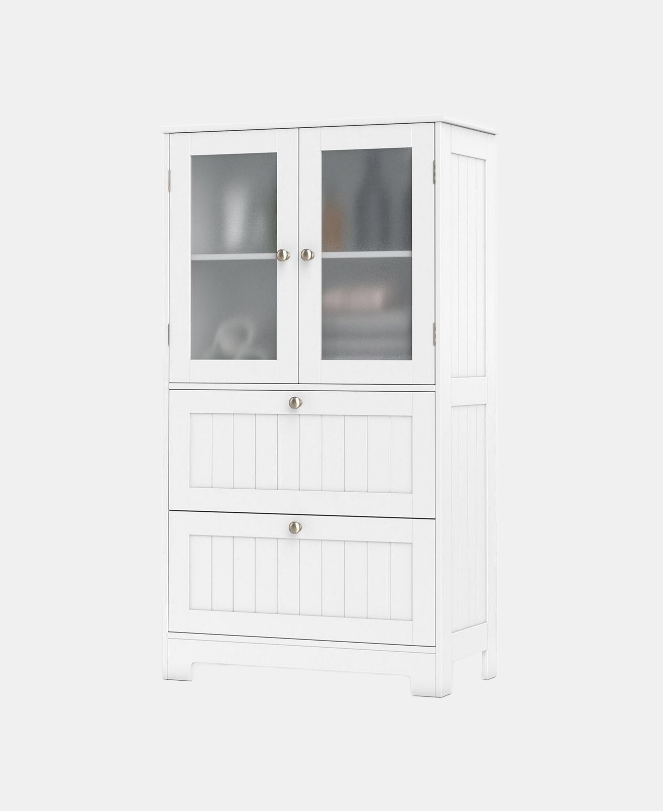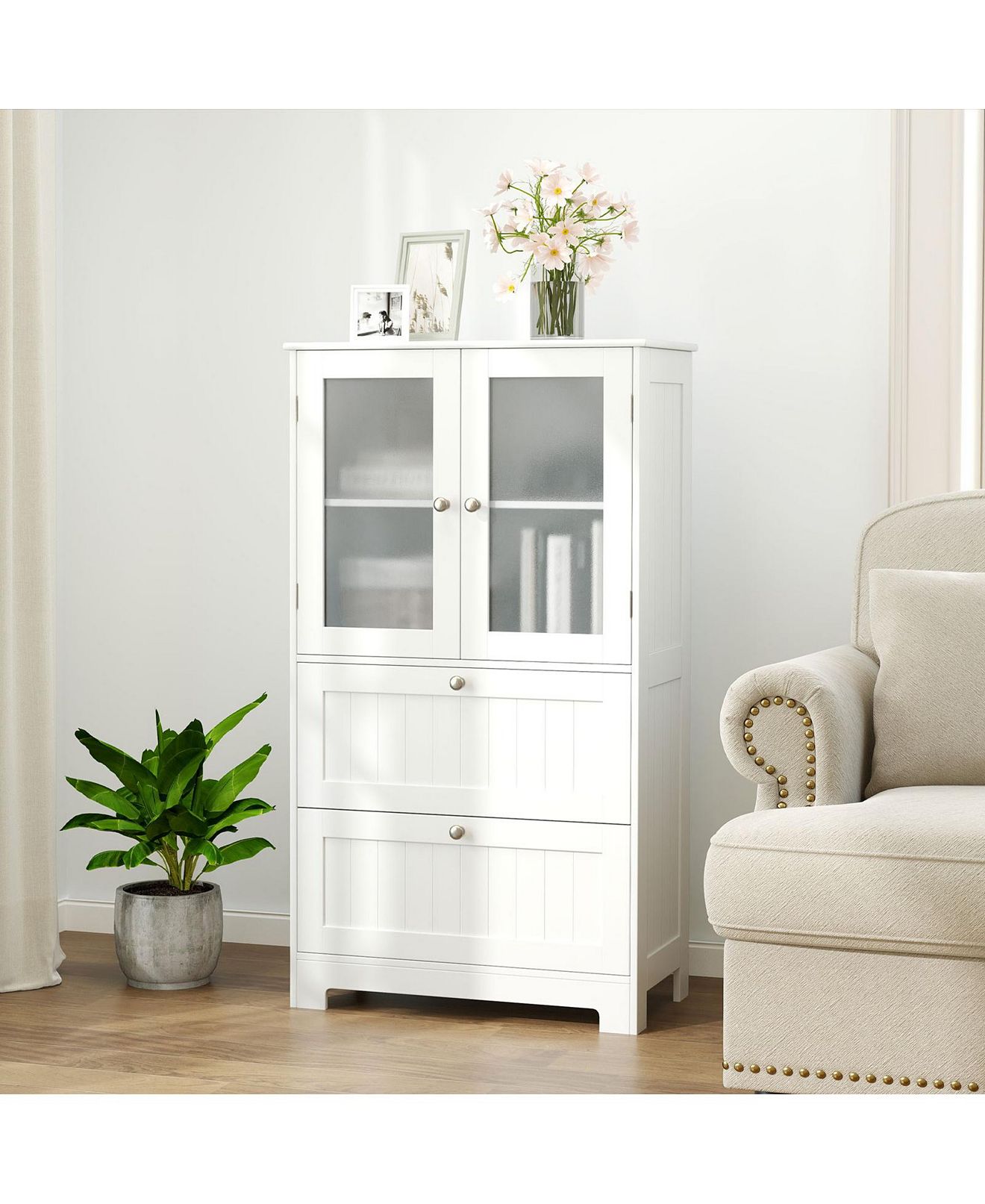 Enhance your home organization with this versatile floor storage cabinet. Featuring an enclosed cabinet, and 2 large drawers, it offers ample storage space for a variety of items. The adjustable shelf allows for customization, catering to different storage needs. Safety is prioritized with anti-toppling devices and tempered glass doors. The modern and stylish design adds elegance to any room, making it a seamless addition to your home decoration.Features:Built in a removable shelf with 3 adjustable heights Ample storage space with a cabinet and 2 drawers Crafted with frosted tempered glass doors