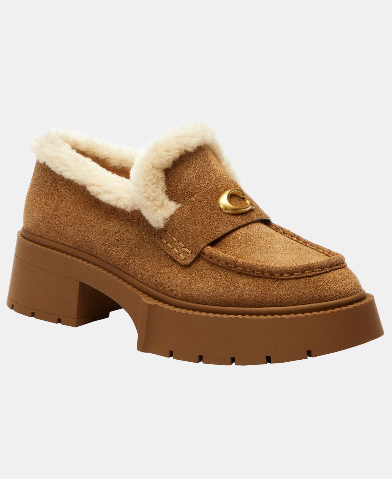 Featuring a suede and shearling upper, these COACH loafers offer a slip-on design with a platform for added height. The heel pattern lends a comfortable and stylish lift to your body.