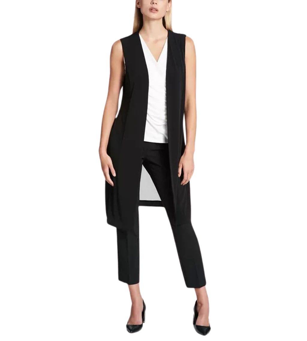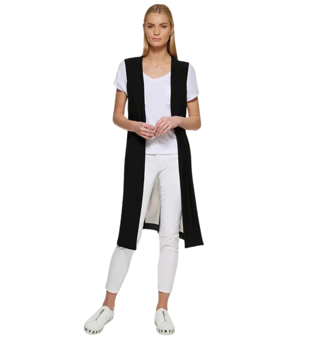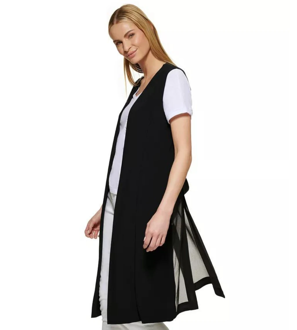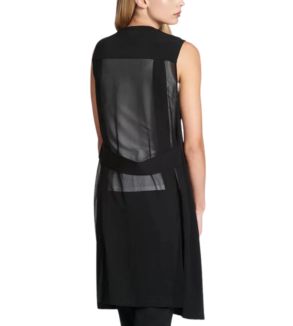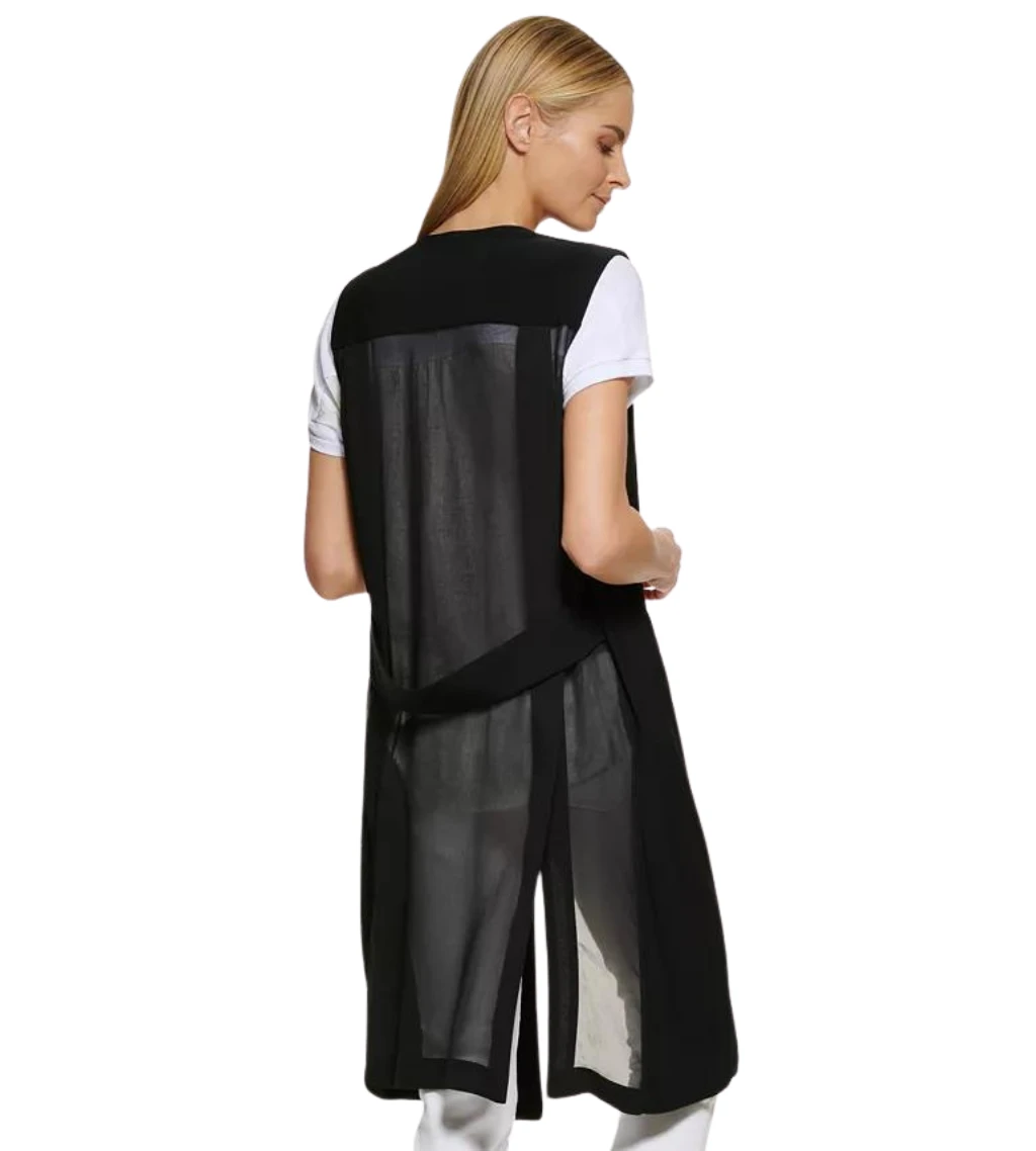 Elevate your layers in DKNY’s modern take on the vest. With its fusion of classic trench details, an oversized, fluid silhouette, and sheer back panels, you’ll wonder how you went so long without it.
