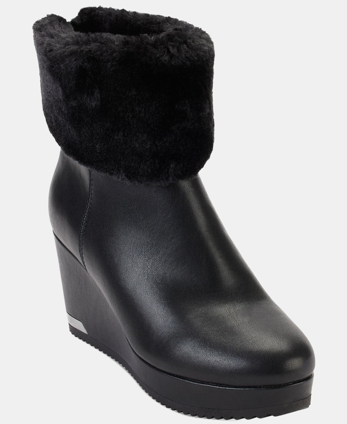 Fluffy faux-fur collars add cold-weather appeal to a sleek wedge lift in the versatile Nadra booties from DKNY.