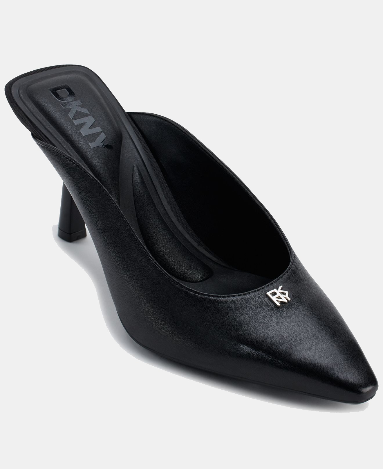 DKNY Women’s Netta gleaming logo hardware makes a signature statement on a streamlined mule framed by a slender toe and tapered heel.