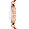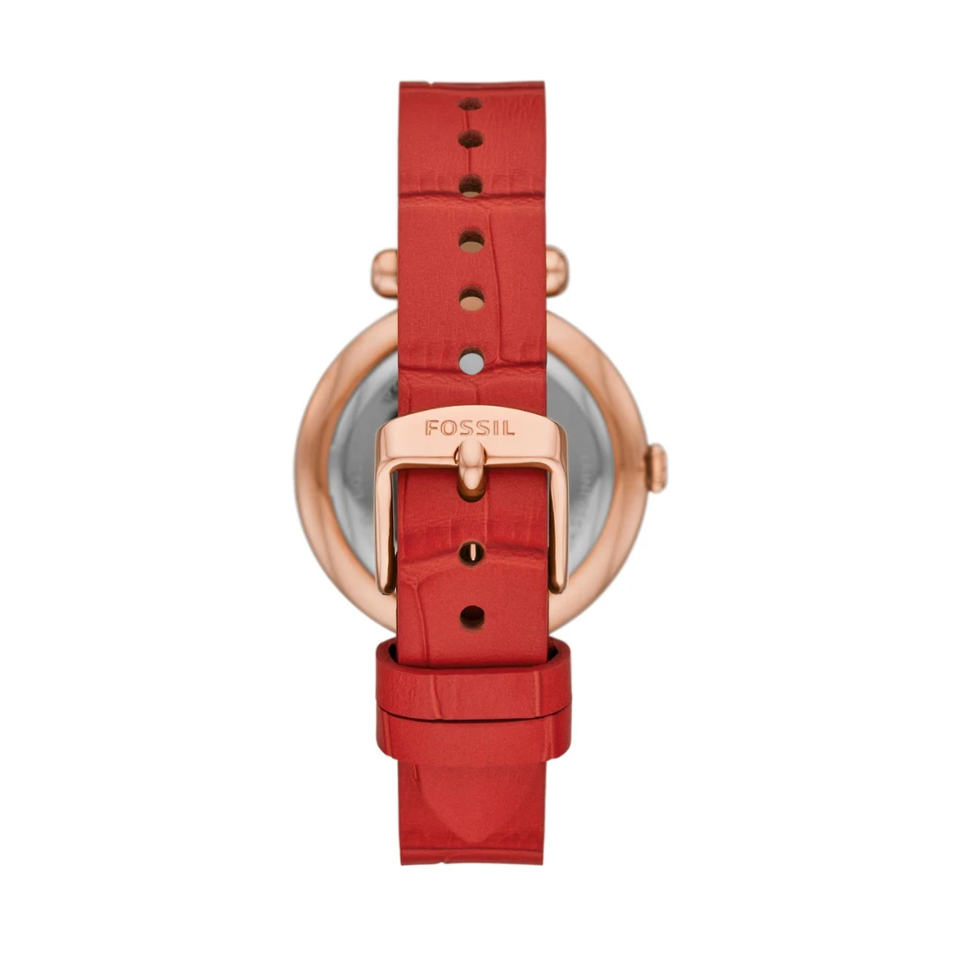 This 36mm Tillie features a white mother-of-pearl dial, three-hand movement and red leather strap.