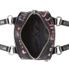 Compact nylon crossbody featuring an allover logo print, dual zip compartment design, top handles and crossbody strap.