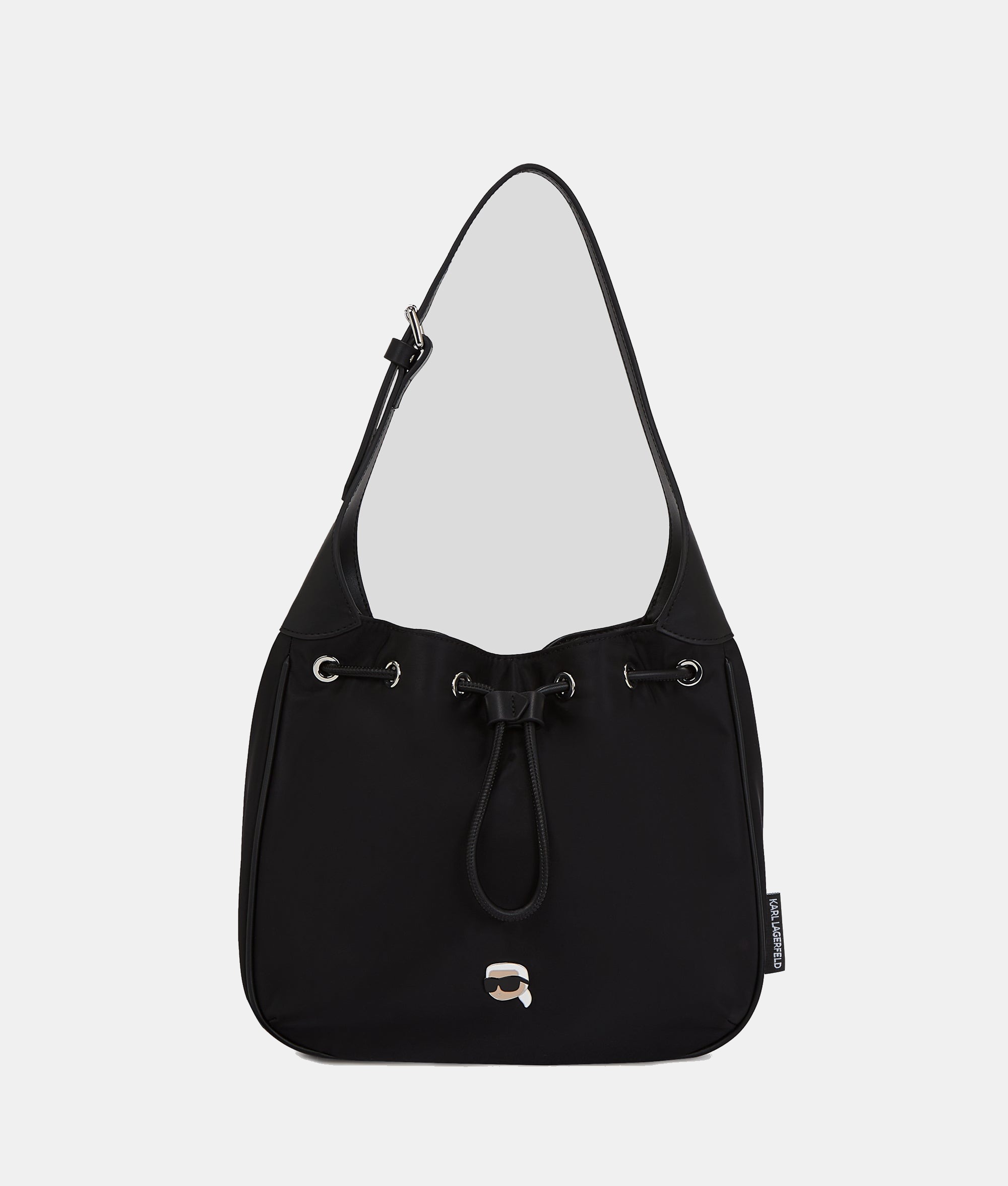 Discover this eye-catching shoulder bag, a chic companion that effortlessly blends style and functionality. Featuring a magnetic closure with playful drawstring detailing, it ensures easy access to your essentials. An adjustable shoulder strap enhances comfort, while a distinctive Ikon Karl pin adds a signature touch.