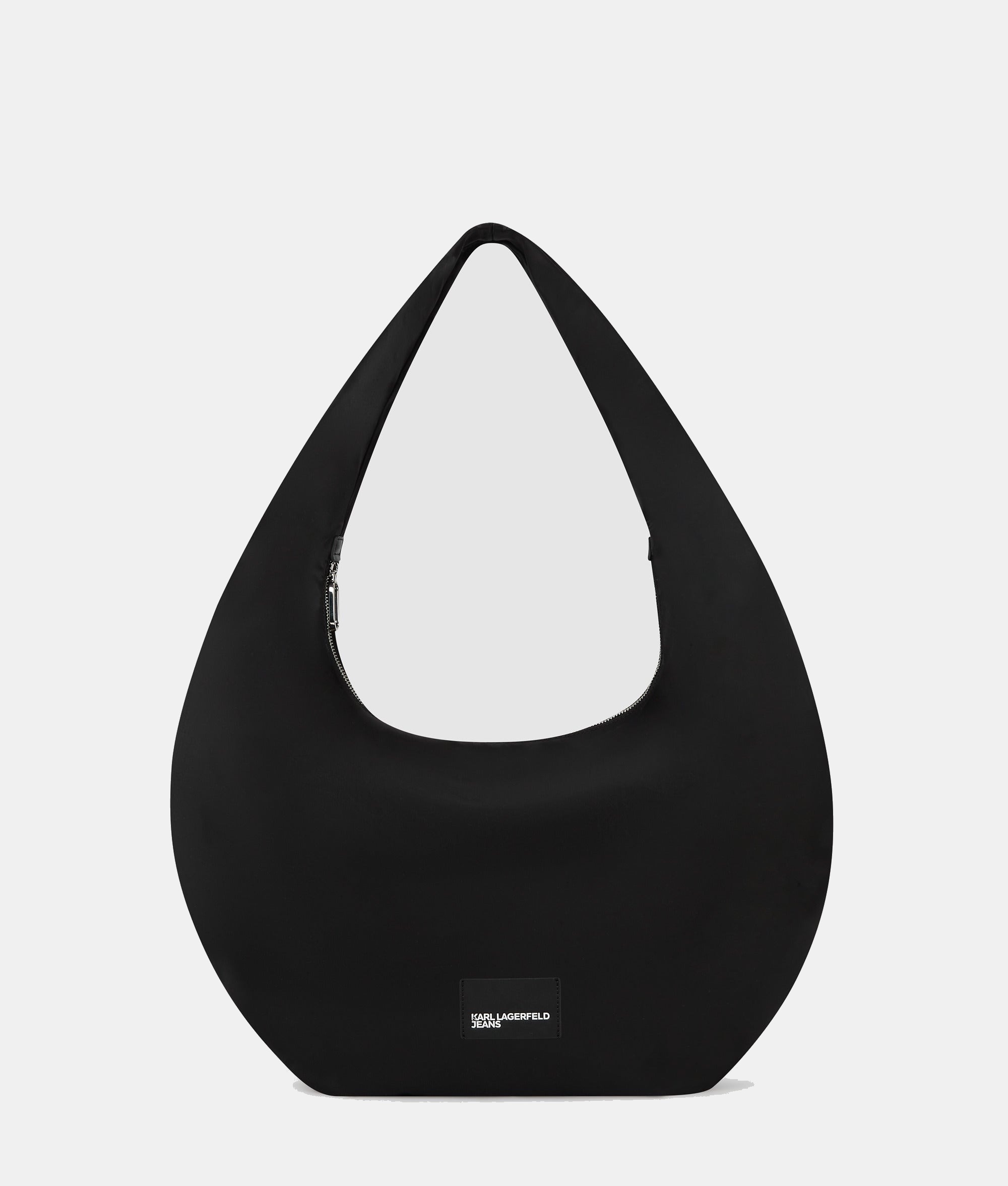 A sleek, shiny fabrication meets contemporary design in this large hobo bag, featuring a slouchy silhouette and a bold structured handle. A zip closure keeps items safe, while a subtle KARL LAGERFELD JEANS logo patch anchors the piece.
