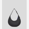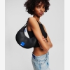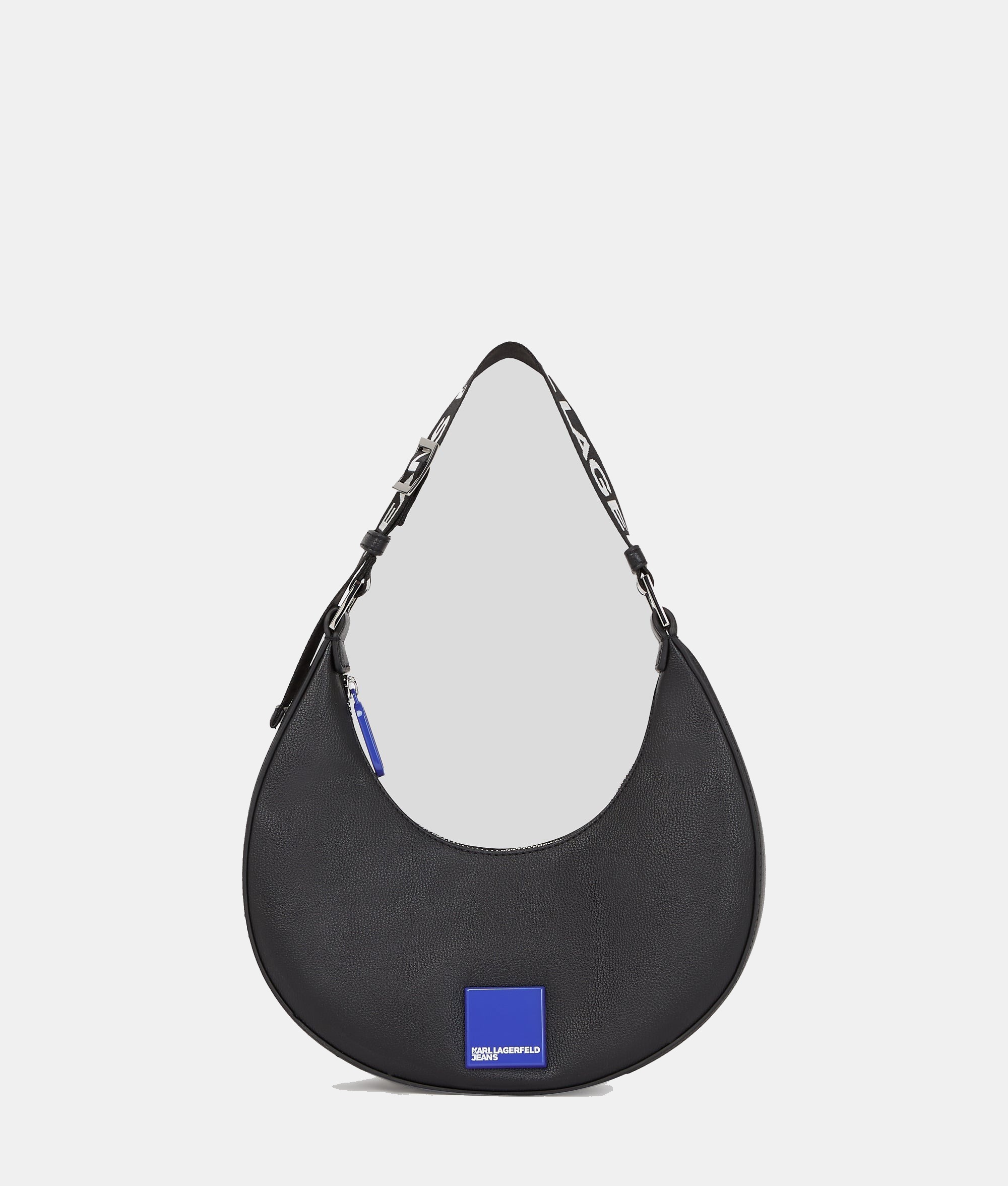 The half-moon shoulder bag showcases a sleek silhouette that comfortably Practical accessorizing with impact. Made to sit snug under the arm, this half-moon shoulder bag features a KARL LAGERFELD JEANS-branded webbing strap and metal box logo for playful attitude.