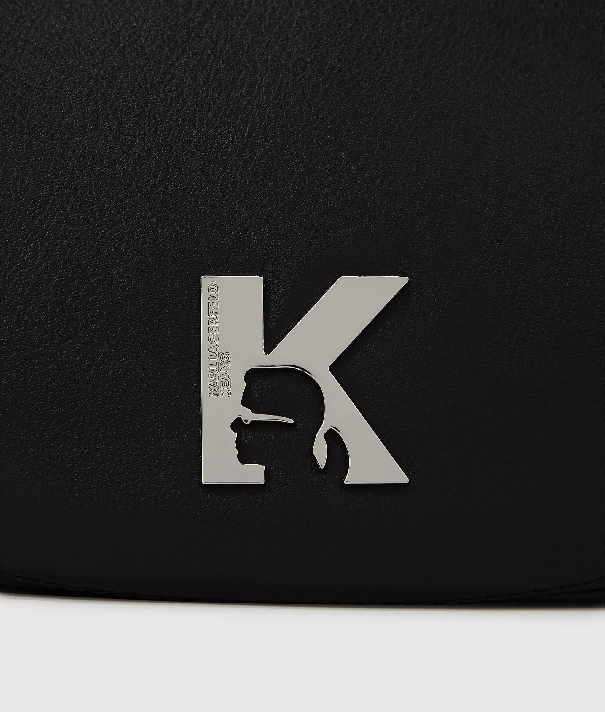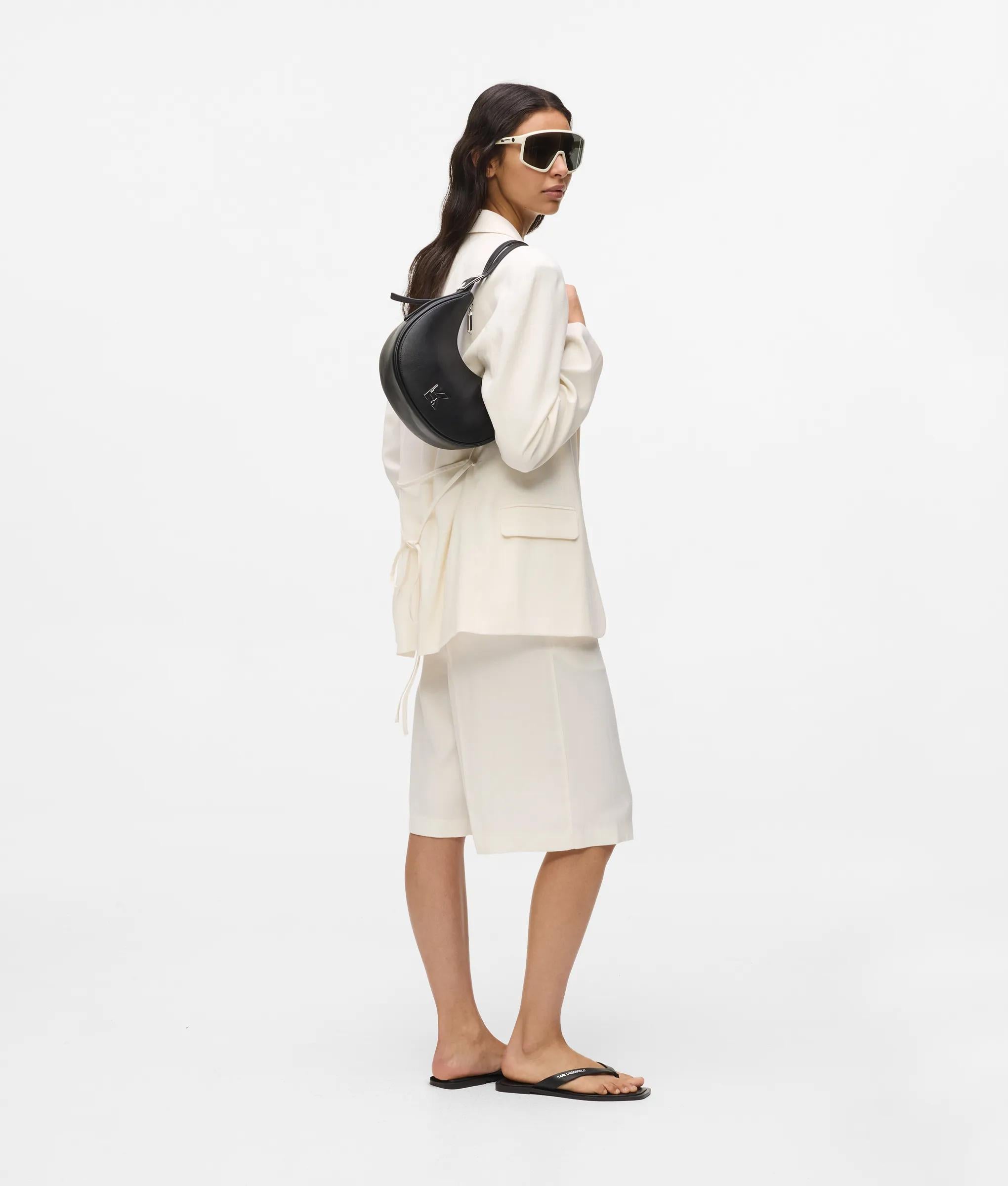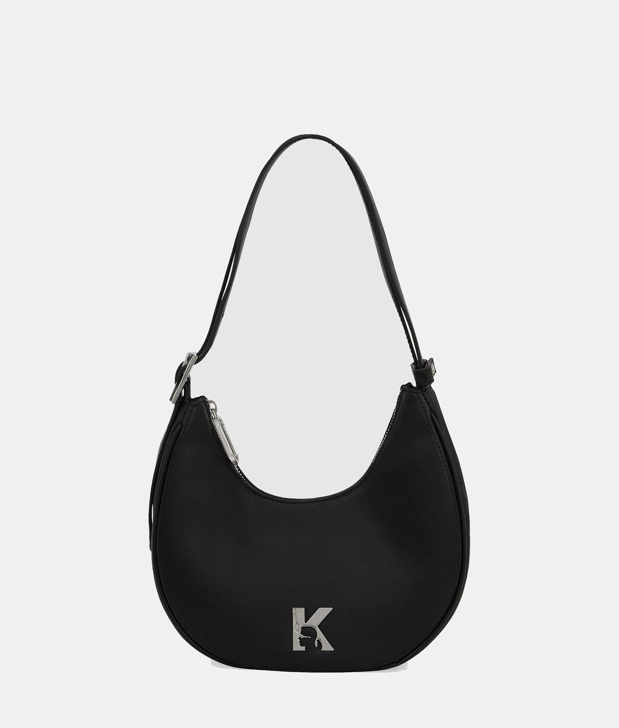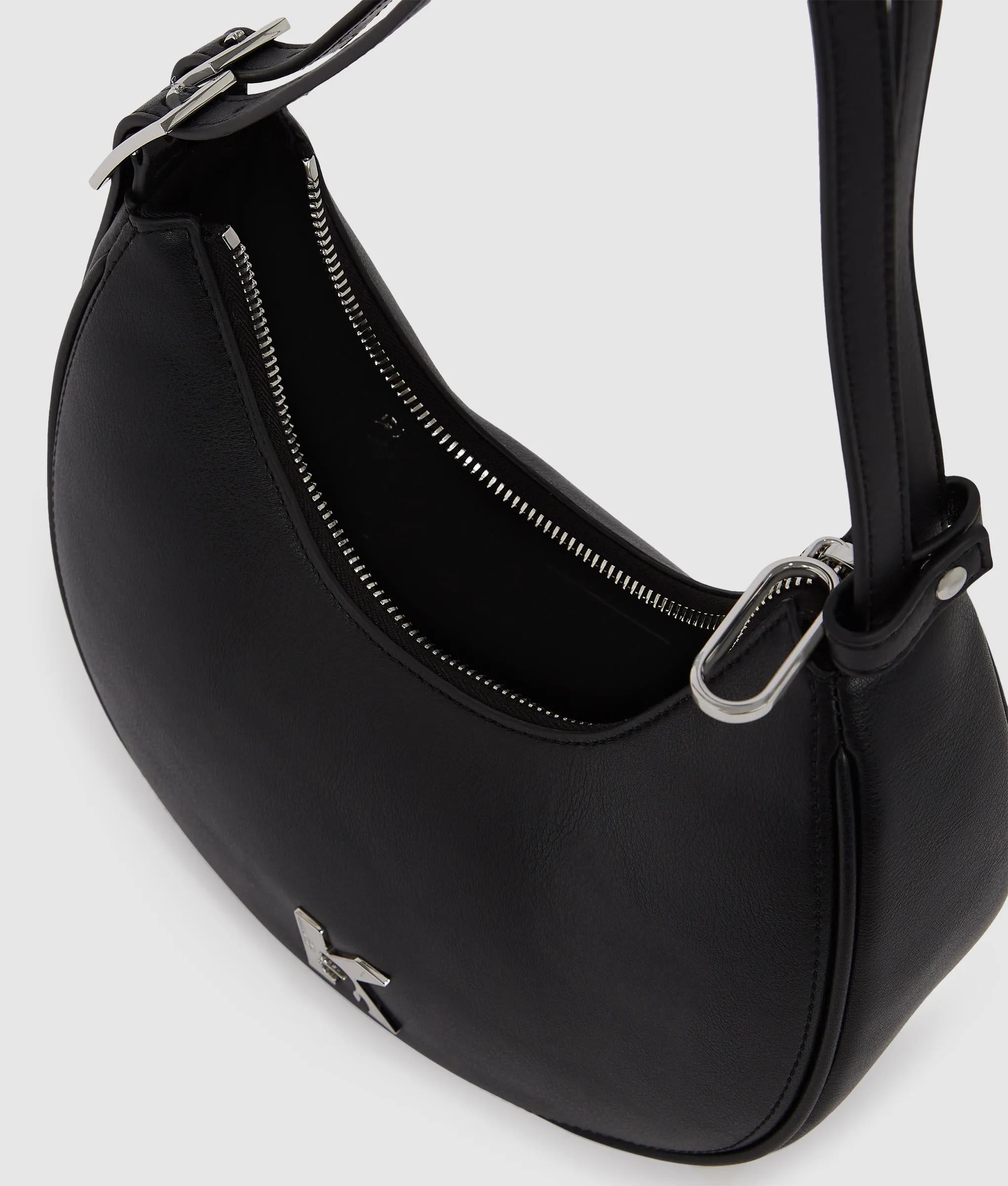 A contemporary moon-shaped shoulder bag with adjustable twin straps and bold metal buckles. A zip-top secures your essentials while the metal K-logo makes a confident statement.