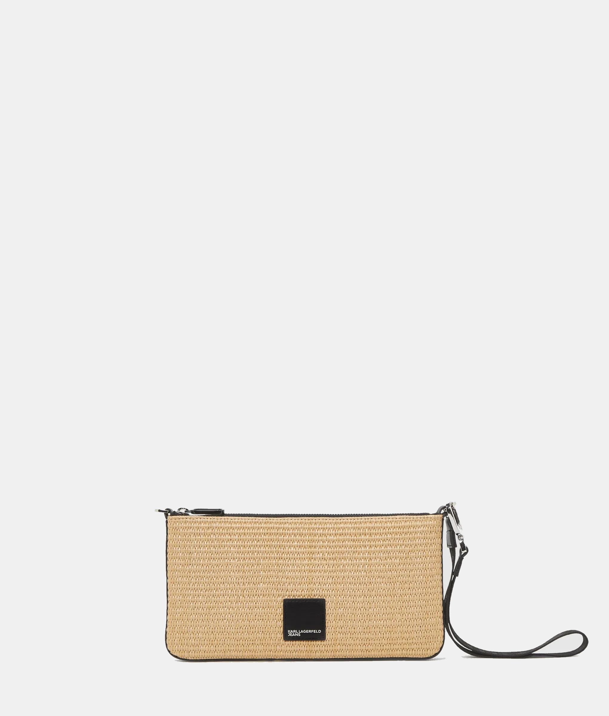 Express your style with this sleek pouch, featuring a shoulder strap that can be converted into a wristlet. A summery woven finish and bold KARL LAGERFELD JEANS complete the versatile piece.