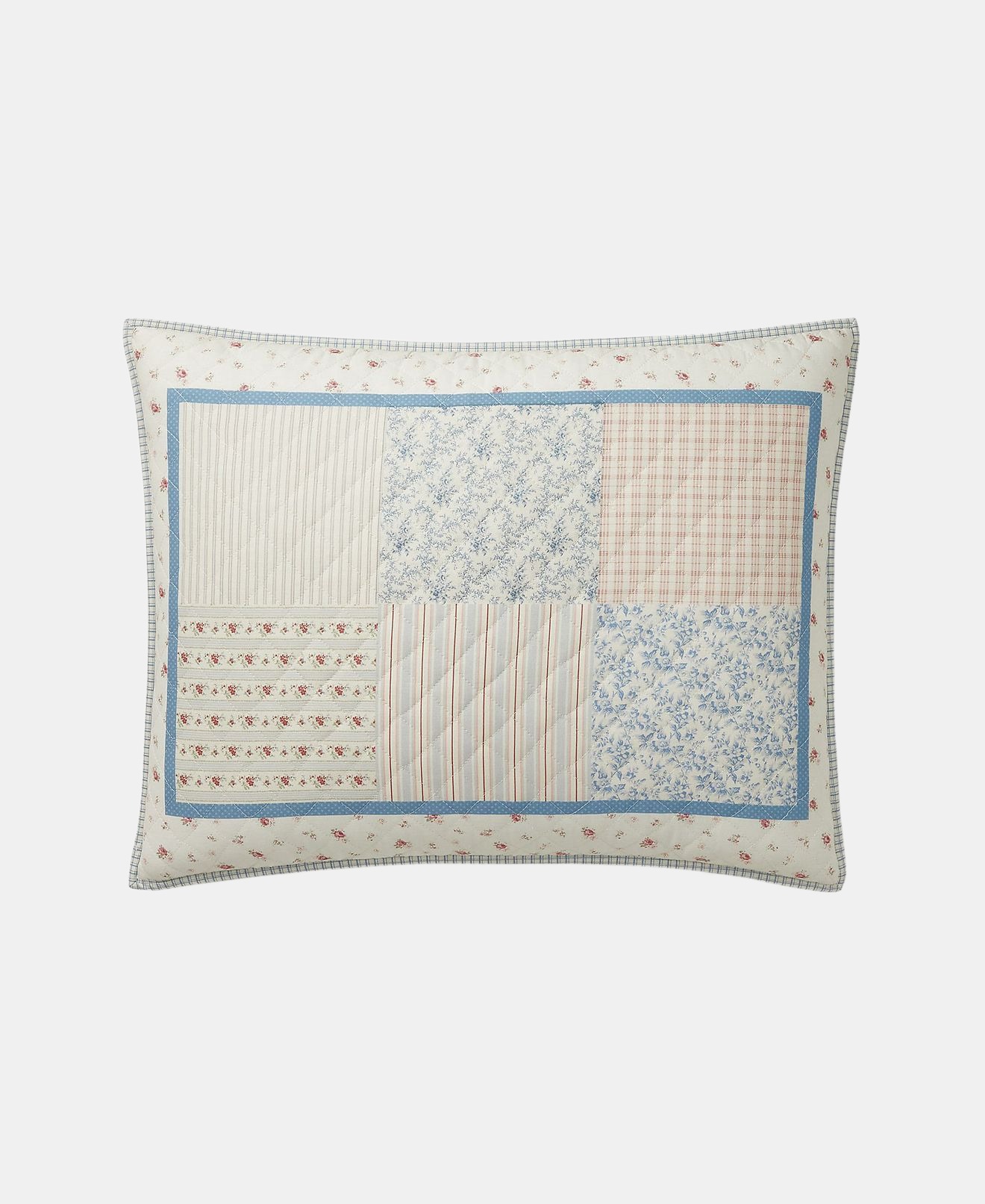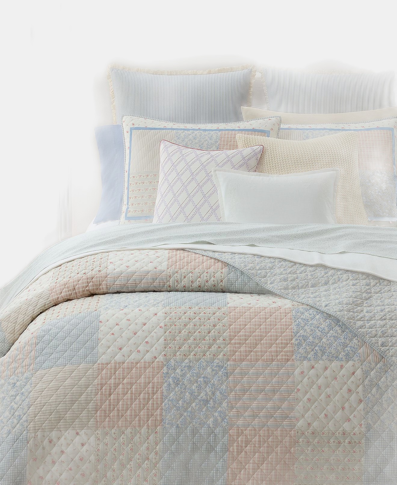 A patchwork of garden-inspired florals come together to create this this soft cotton quilt, which is accented by mini-check binding at the edges and reverses to reveal a complementary motif.