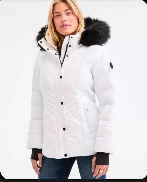 Michael Kors Women’s Faux-Fur-Trim Hooded Puffer Coat – White with Black Faux Fur – Size XXL