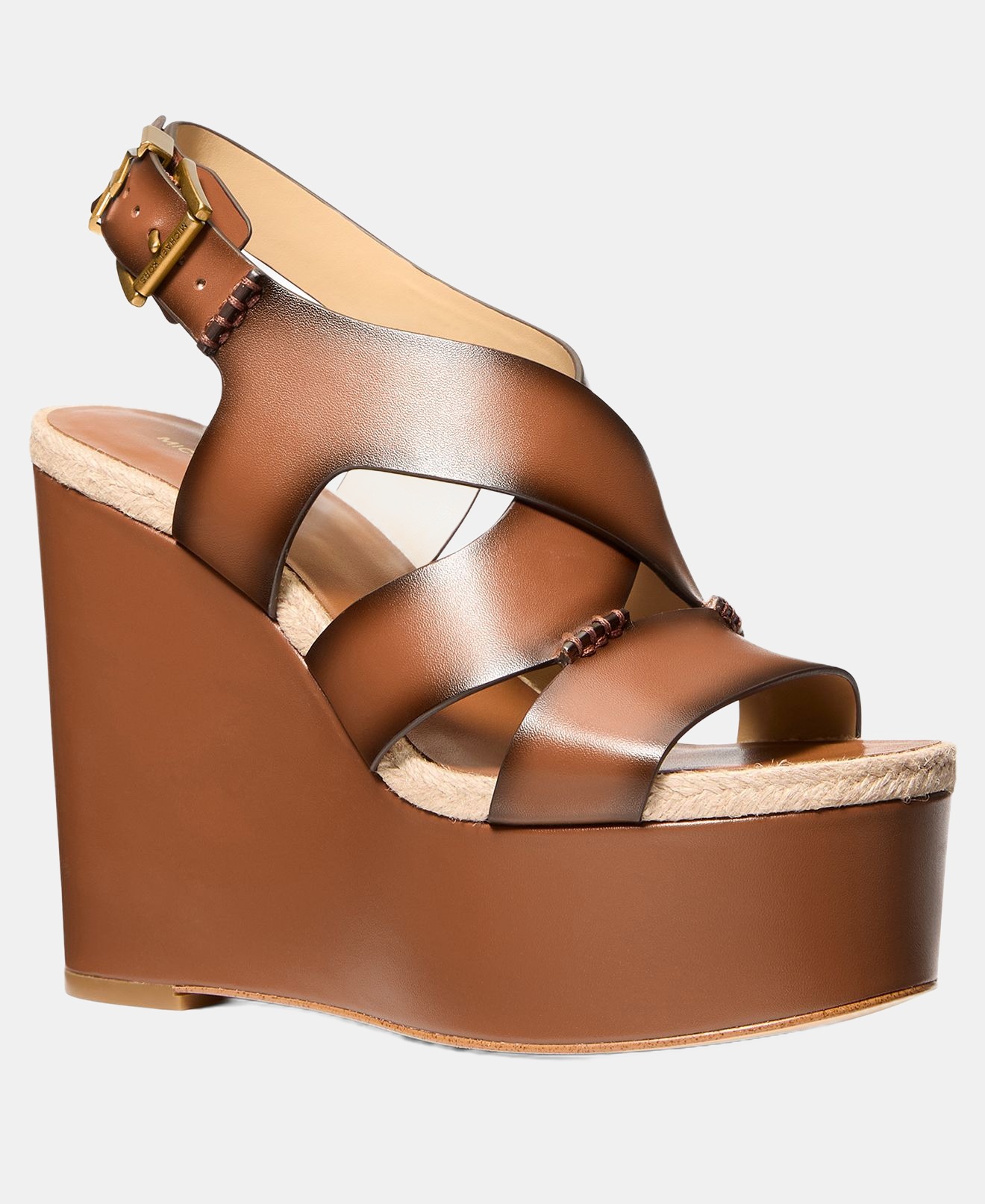 Burnished leather straps and jute trim give our Raven sandal a bohemian attitude, while the towering wedge sole adds flattering height and provides all-day stability. Style it with breezy dresses or wide-leg pants to let the striking silhouette take center stage.