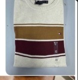 Tommy Hilfiger Striped Crewneck Sweater – Light Beige/Cream with Brown and Burgundy Stripes – Size large