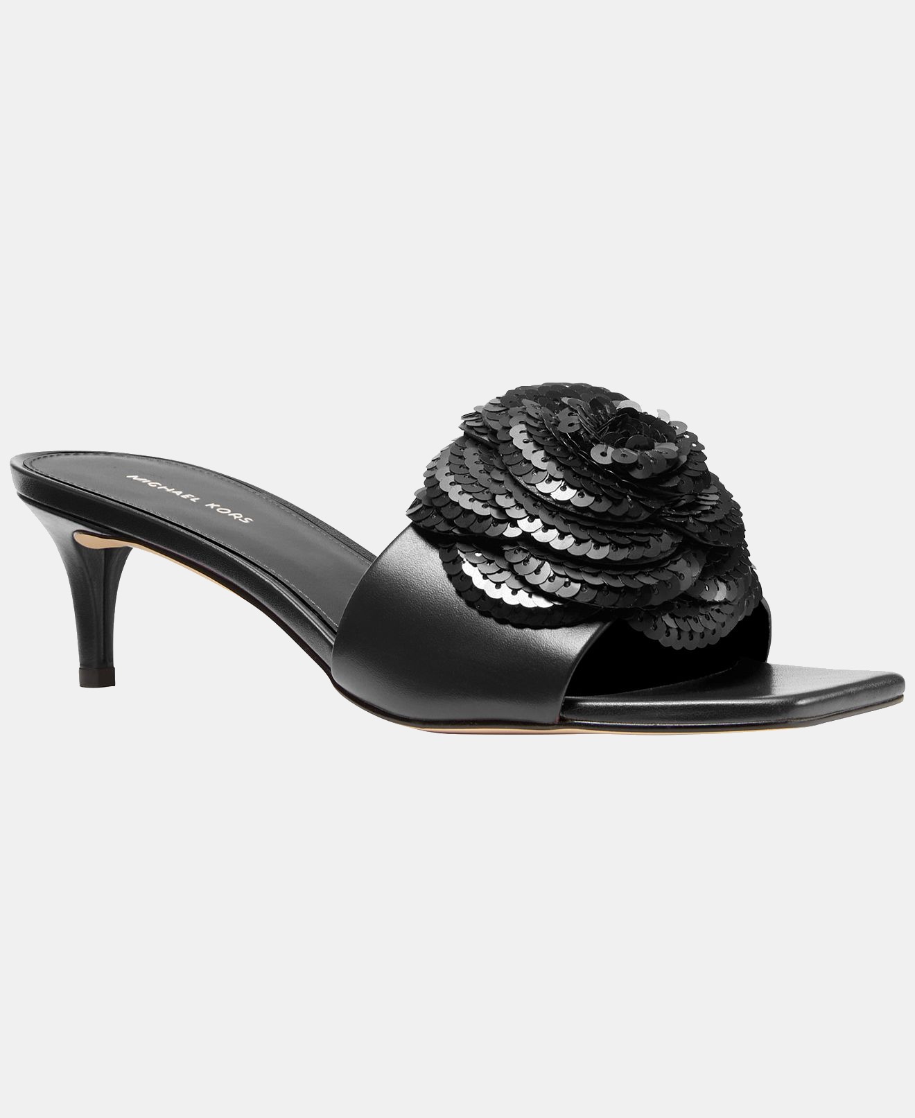 Combining a square toe with a slip-on mule design, these Michael Kors sandals deliver effortless and contemporary style. The heeled silhouette provides a subtle and chic elevation.