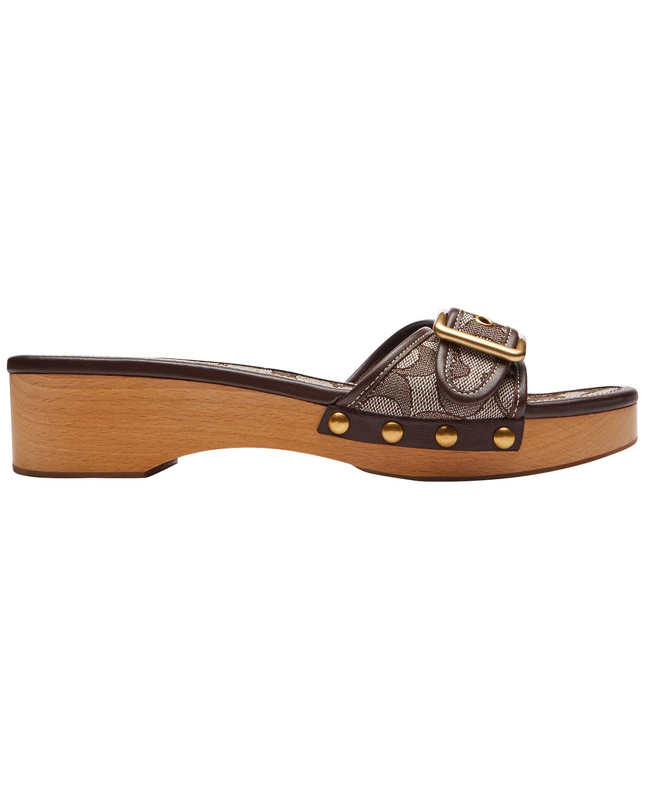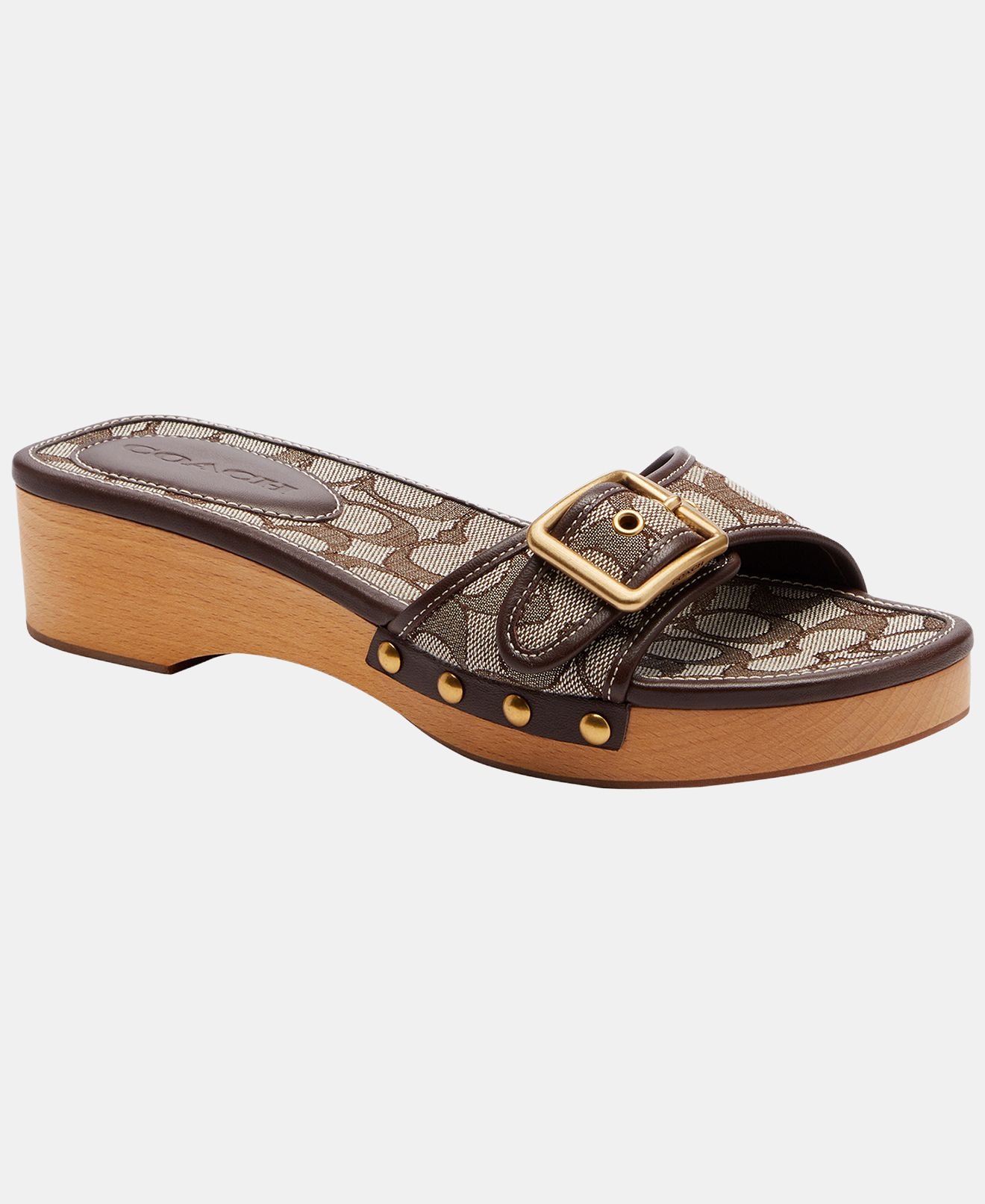 Statement details distinguish these COACH Margot wooden sandals, featuring a slip-on silhouette for easy styling. Round toe enhances flexibility, while a wedge heel offers graceful elevation.