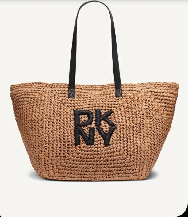 Woven Straw Tote Bag with DKNY Logo – Tan/Brown with Black handles